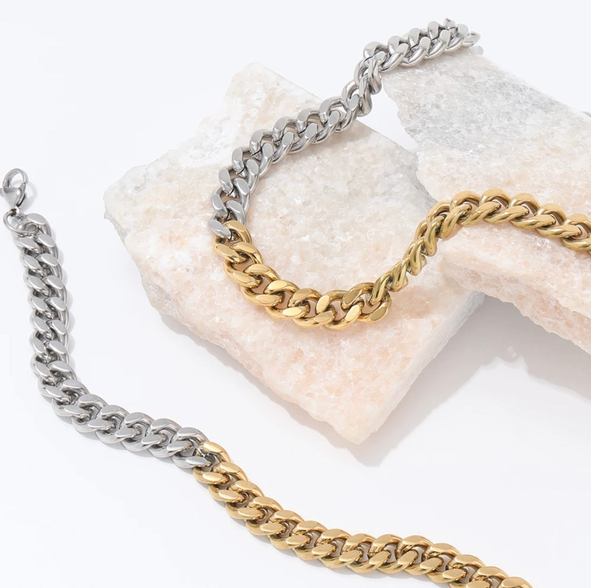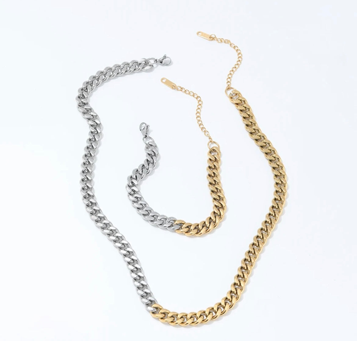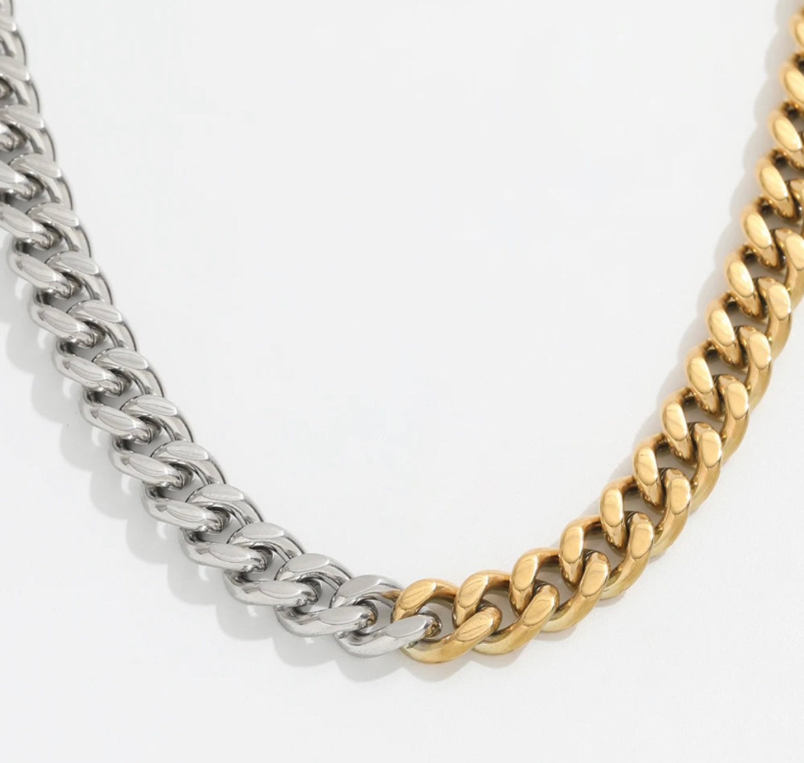 The ABBY Gold Plated two-tone Cuban Link Chain is an eye-catching addition to any look. Crafted from stainless steel and plated in gold and silver, this luxurious chain will add a touch of sophistication to any ensemble. With a classic Cuban link design, this chain will stand out while remaining timeless.