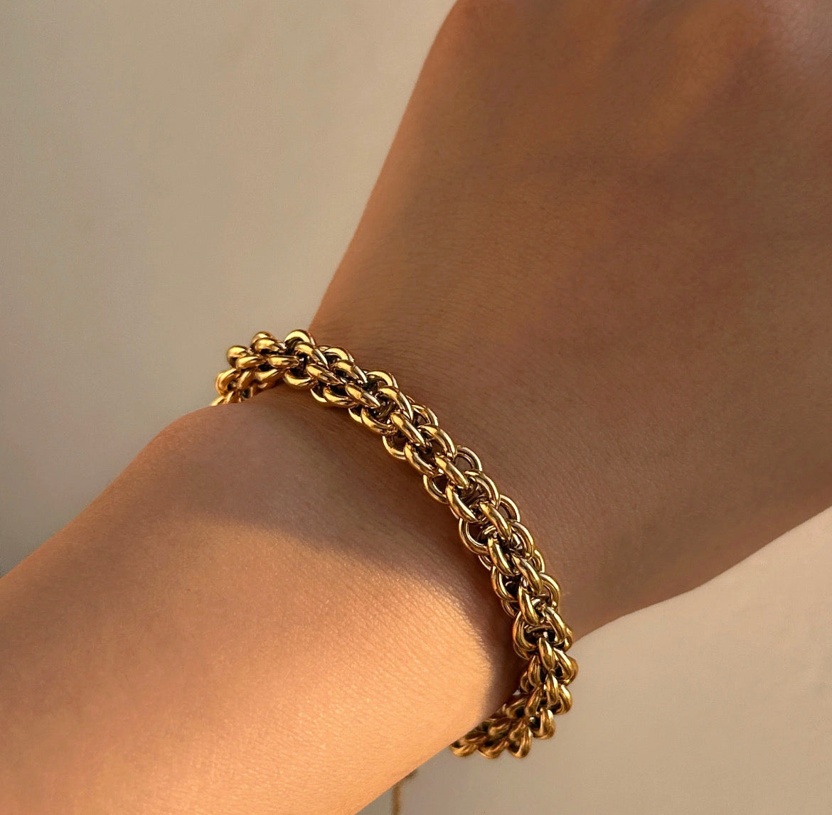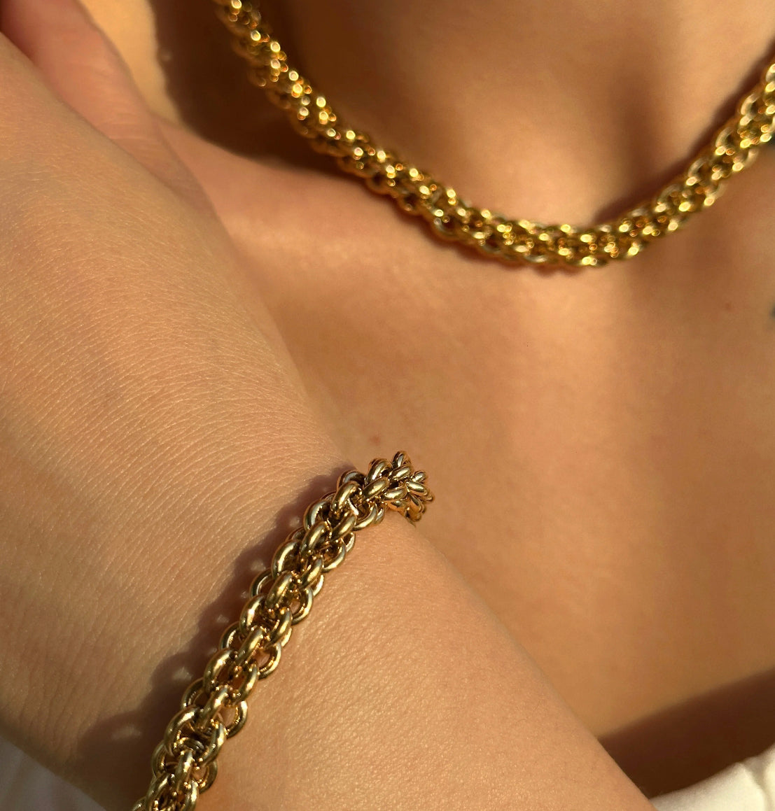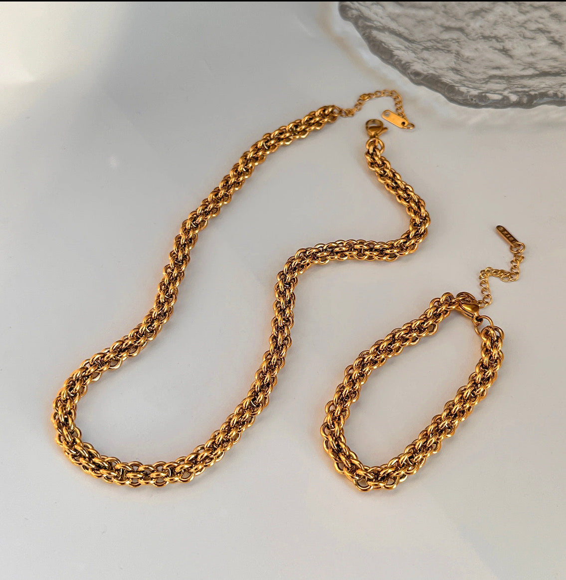 This BERSA stainless steel set is perfect for adding a touch of sophistication and elegance to your everyday look. Crafted with 18K gold plating and a chunky twist design, this necklace and bracelet set will surely turn heads. With its timeless modern design, this set is the perfect accompaniment to any outfit.