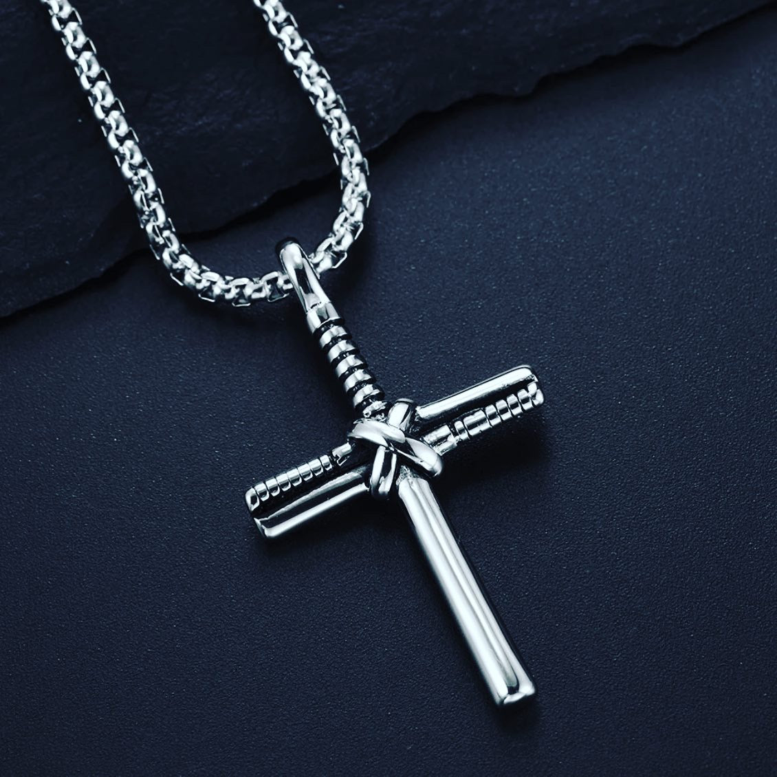 The MEKII Baseball Bat Cross is a durable and stylish men's accessory made from stainless steel plating. Its unique design is perfect for any baseball enthusiast, adding a touch of sophistication to any outfit. Elevate your style game with this must-have piece.